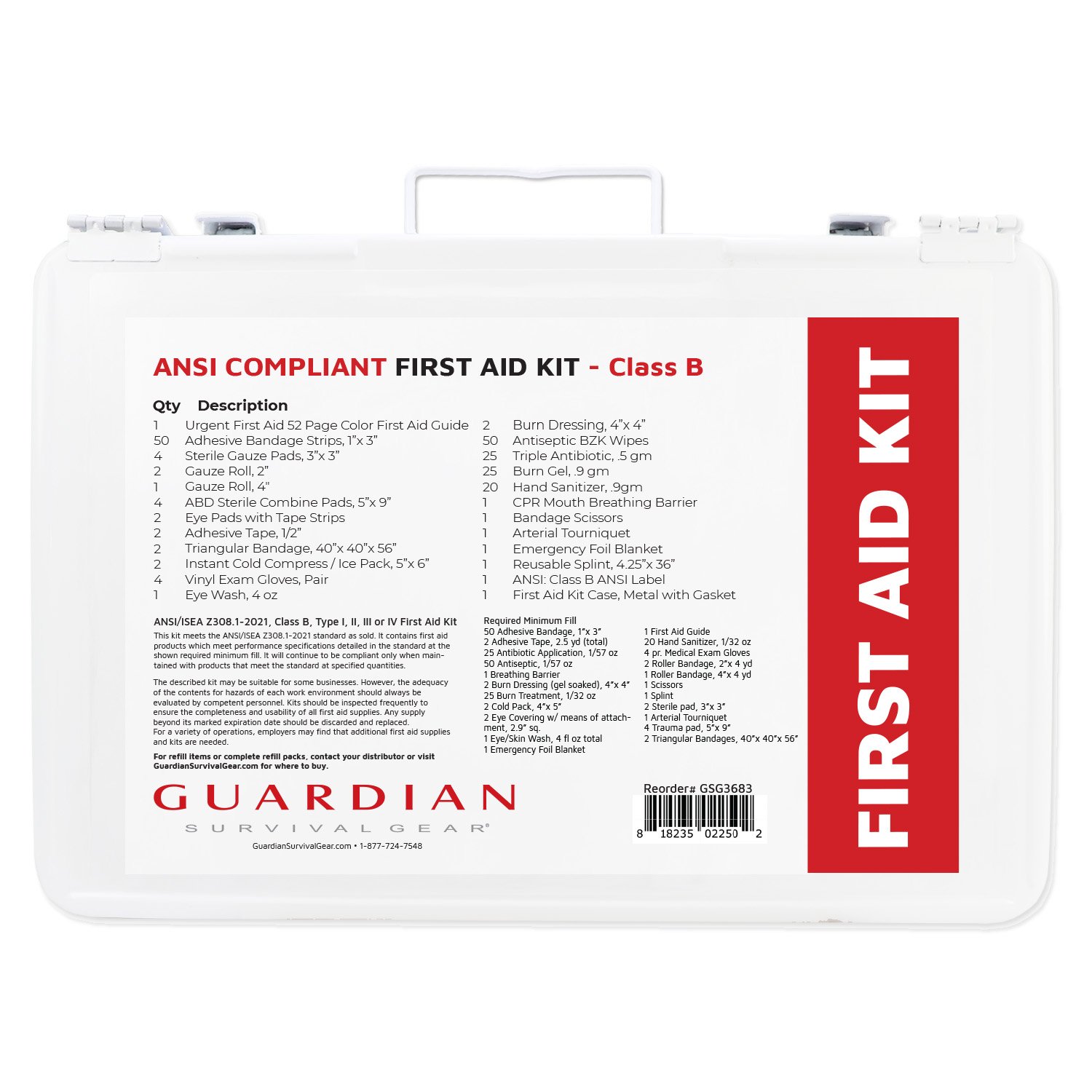 Guardian Survival Gear First Aid Kit, 209 Pieces, ANSI Class B, 25 to 50 Person in a sturdy, gasketed and steel case that is both portable and wall mountable. Meets requirements for ANSI case types I, II, III. This kit meets or exceeds OSHA and ANSI 2021 Standard fill requirements, so you know you and your employees will be covered with the new ANSI 2021 requirements. This ANSI First Aid Kit includes the assortment and quantity of first aid supplies intended to deal with most types of injuries and sudden illnesses encountered in the workplace including: major wounds, minor wounds (cuts and abrasions), minor burns, sprains and strains, and eye injuries. The Guardian Survival Gear Aid ANSI B kit is great for workplaces ranging from offices to production facilities and warehouses of up to 50 people, and is easily wall mounted, or removed to be taken to the accident scene. Includes: